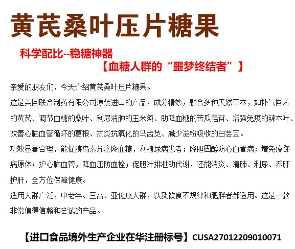 【產(chǎn)品名稱】:黃芪桑葉壓片糖果 進(jìn)口產(chǎn)品