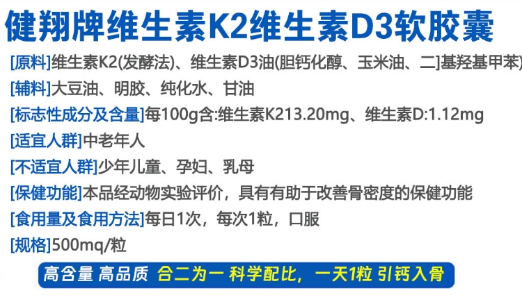 【產(chǎn)品名稱】:健翔牌 維生素K2維生素D3軟膠囊