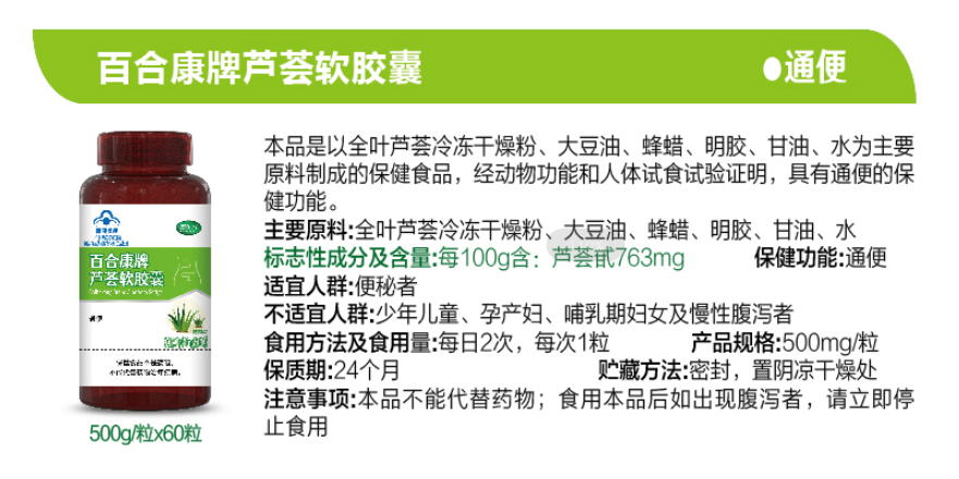 【產(chǎn)品名稱】:百合康牌蘆薈軟膠囊