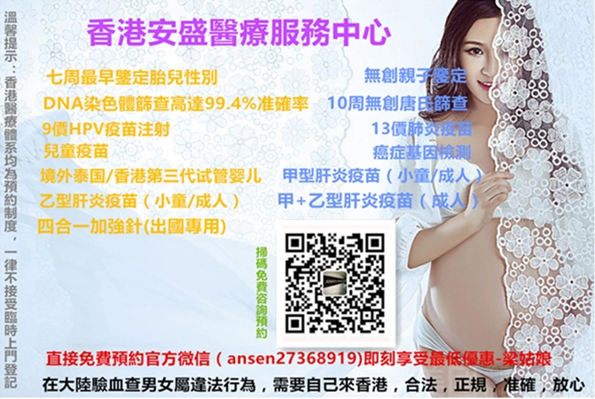 若刪或者打不開(kāi)請(qǐng)點(diǎn)快照*香港安盛醫(yī)療中心24小時(shí)免費(fèi)咨詢,熱線: 00852-27368366 直接預(yù)約官方微信(ansen27368919)即刻享受最低優(yōu)惠-梁姑娘-*香港化驗(yàn)所做DNA鑒定胎兒性別, 安全-快速-準(zhǔn)確-無(wú)創(chuàng), 1-2天可出鑒定結(jié)果,詳細(xì)流程,歡迎來(lái)電咨詢預(yù)約! 其它項(xiàng)目:(香港無(wú)創(chuàng)親子鑒定、10周無(wú)創(chuàng)唐氏篩查、13價(jià)肺炎疫苗注射、兒童疫苗注射、9價(jià)HPV疫苗注射、試管嬰兒、癌癥基因檢測(cè)…),(在大陸驗(yàn)血查男女屬違法行為,需要自己來(lái)香港,合法,正規(guī),準(zhǔn)確,放心)。