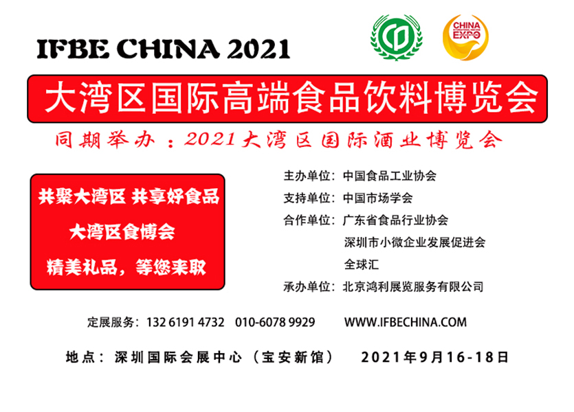 2021年9月16-18日,由中國食品工業(yè)協(xié)會主辦,北京鴻利展覽服務(wù)有限公司承辦的2021大灣區(qū)國際高端食品飲料博覽會(以下簡稱“2021 IFBE China大灣區(qū)食博會”)將在深圳國際會展中心(寶安新館)舉辦。本屆大灣區(qū)食博會以“共聚大灣區(qū)、共享好食品”為主題,以全球化視野來詮釋未來食品酒水飲料行業(yè)發(fā)展的趨勢,全力打造食品酒水飲料行業(yè)的國際化貿(mào)易平臺。