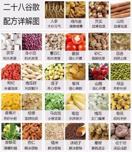 二十八谷散由28位配方組成:其中主料18味,輔料10味。主料包含:雞內(nèi)金、赤小豆、薏苡仁、芡實(shí)、山藥、枸杞、南瓜籽、蓮子、百合、銀耳、香蕉片、金銀花、菊花、馬齒覽、菊苣、葛根、魔芋粉、糙米。輔料包含:茯苓、桔梗、綠豆等。由于種類繁多不一一列出了.二十八谷散是目前去濕氣類產(chǎn)品中集大成者。