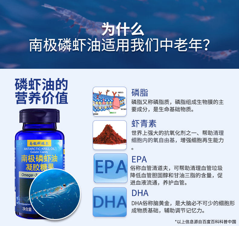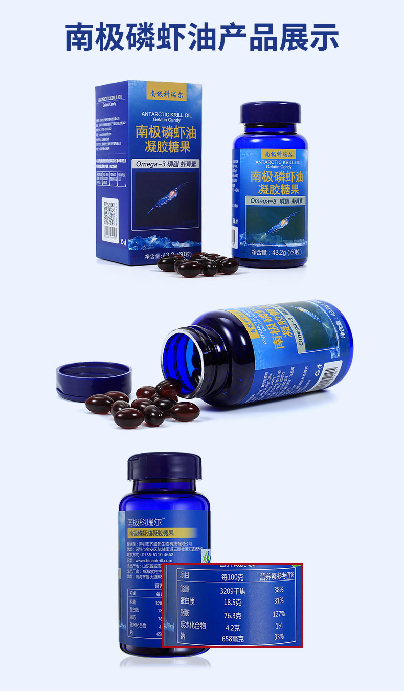 目前,全球有3億人在食用南極磷蝦油(美國2億人)。南極磷磷蝦油含有Omega-3必需脂肪酸二十碳五烯酸(EPA)和二十二碳六烯酸(DHA)。Omega-3必需脂肪酸有很多促進健康的益處,包括心、腦、血管,神經,骨骼和關節(jié),視力,皮膚等。其不飽和脂肪酸是目前自然界中僅有以磷脂型態(tài)結合ω-3(EPA、DHA)和多樣性抗氧化物(磷脂型蝦青素)的分子結構。南極磷蝦油是> 蝦青素的7.4倍 > 維生素E的1000倍 > 輔酶Q10的800倍 >番茄紅素的60倍 > 茶多酚的300倍 > OPC的150倍 > 一氧化氮的780倍 > 納豆的720倍 它還含有豐富的維生素E、維生素A、蝦青素、磷脂質、類黃酮和功能強大的抗氧化劑。