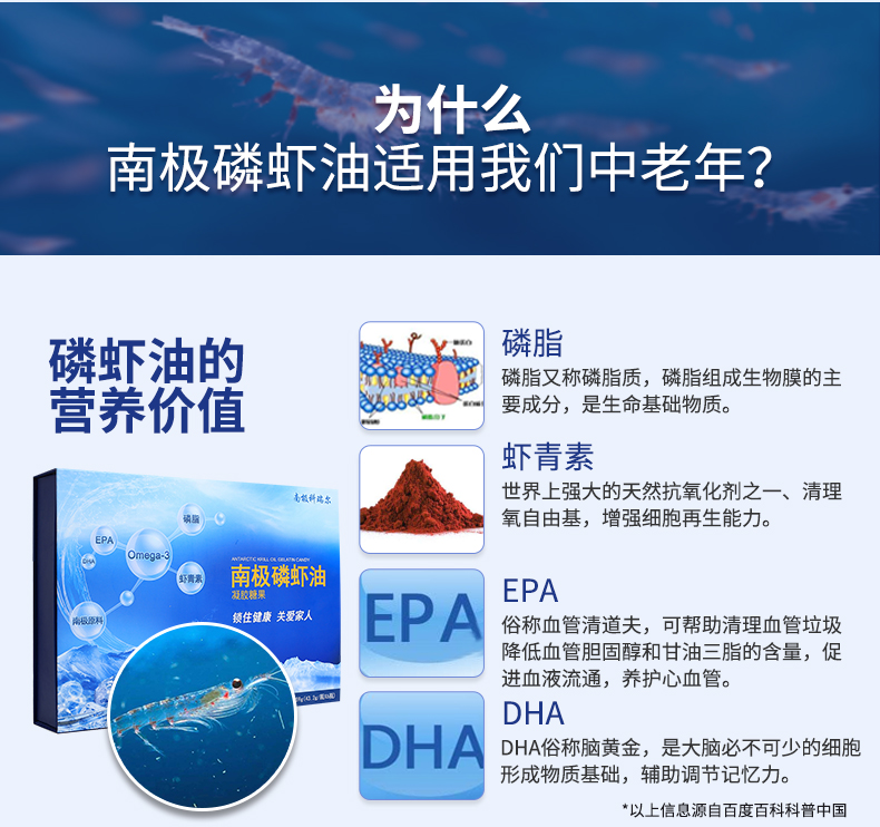 目前,全球有3億人在食用南極磷蝦油(美國(guó)2億人)。南極磷磷蝦油含有Omega-3必需脂肪酸二十碳五烯酸(EPA)和二十二碳六烯酸(DHA)。Omega-3必需脂肪酸有很多促進(jìn)健康的益處,包括心、腦、血管,神經(jīng),骨骼和關(guān)節(jié),視力,皮膚等。其不飽和脂肪酸是目前自然界中僅有以磷脂型態(tài)結(jié)合ω-3(EPA、DHA)和多樣性抗氧化物(磷脂型蝦青素)的分子結(jié)構(gòu)。南極磷蝦油是> 蝦青素的7.4倍 > 維生素E的1000倍 > 輔酶Q10的800倍 >番茄紅素的60倍 > 茶多酚的300倍 > OPC的150倍 > 一氧化氮的780倍 > 納豆的720倍 它還含有豐富的維生素E、維生素A、蝦青素、磷脂質(zhì)、類黃酮和功能強(qiáng)大的抗氧化劑。