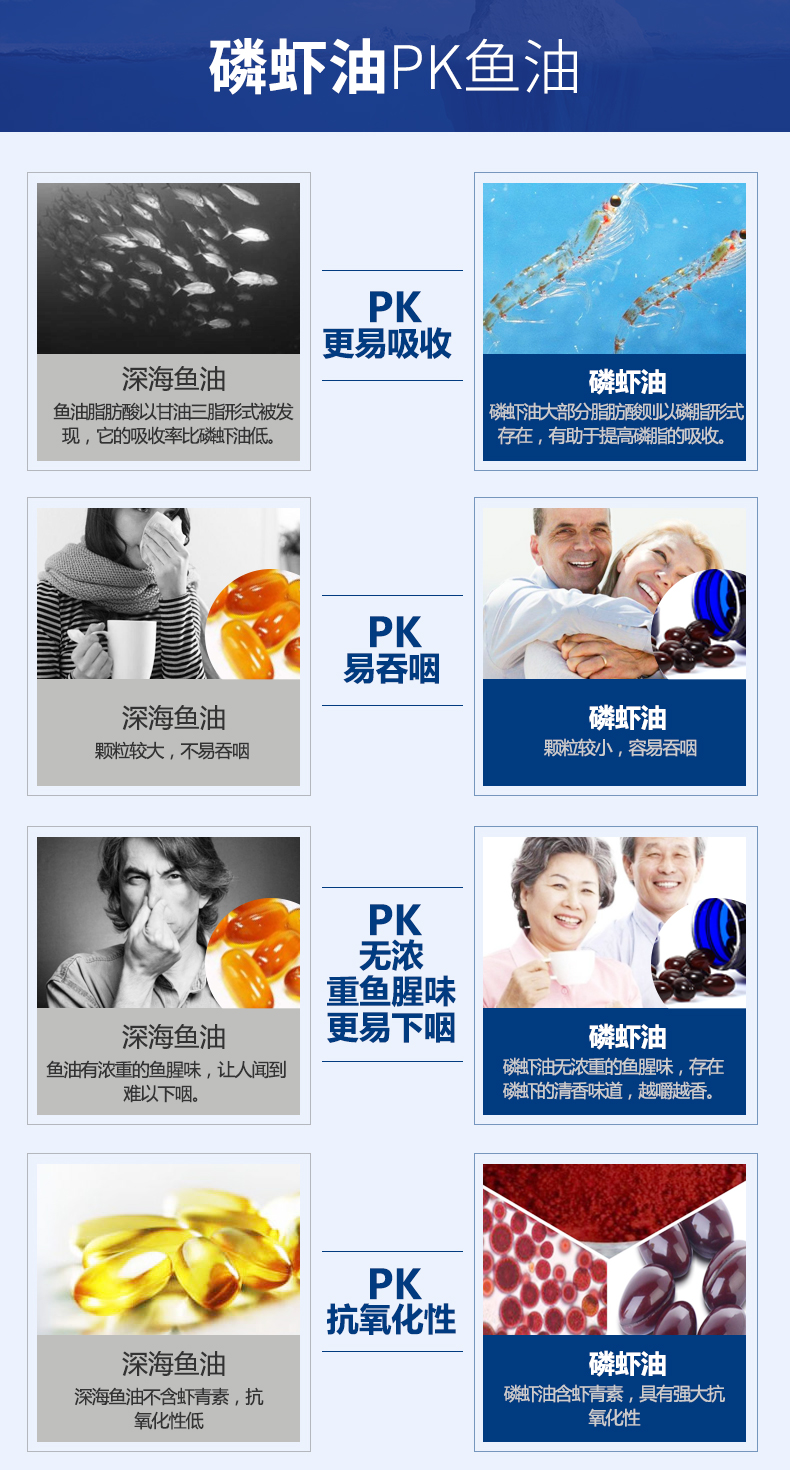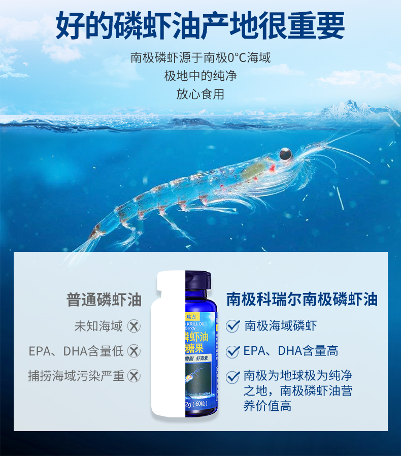 目前,全球有3億人在食用南極磷蝦油(美國(guó)2億人)。南極磷磷蝦油含有Omega-3必需脂肪酸二十碳五烯酸(EPA)和二十二碳六烯酸(DHA)。Omega-3必需脂肪酸有很多促進(jìn)健康的益處,包括心、腦、血管,神經(jīng),骨骼和關(guān)節(jié),視力,皮膚等。其不飽和脂肪酸是目前自然界中僅有以磷脂型態(tài)結(jié)合ω-3(EPA、DHA)和多樣性抗氧化物(磷脂型蝦青素)的分子結(jié)構(gòu)。南極磷蝦油是> 蝦青素的7.4倍 > 維生素E的1000倍 > 輔酶Q10的800倍 >番茄紅素的60倍 > 茶多酚的300倍 > OPC的150倍 > 一氧化氮的780倍 > 納豆的720倍 它還含有豐富的維生素E、維生素A、蝦青素、磷脂質(zhì)、類黃酮和功能強(qiáng)大的抗氧化劑。