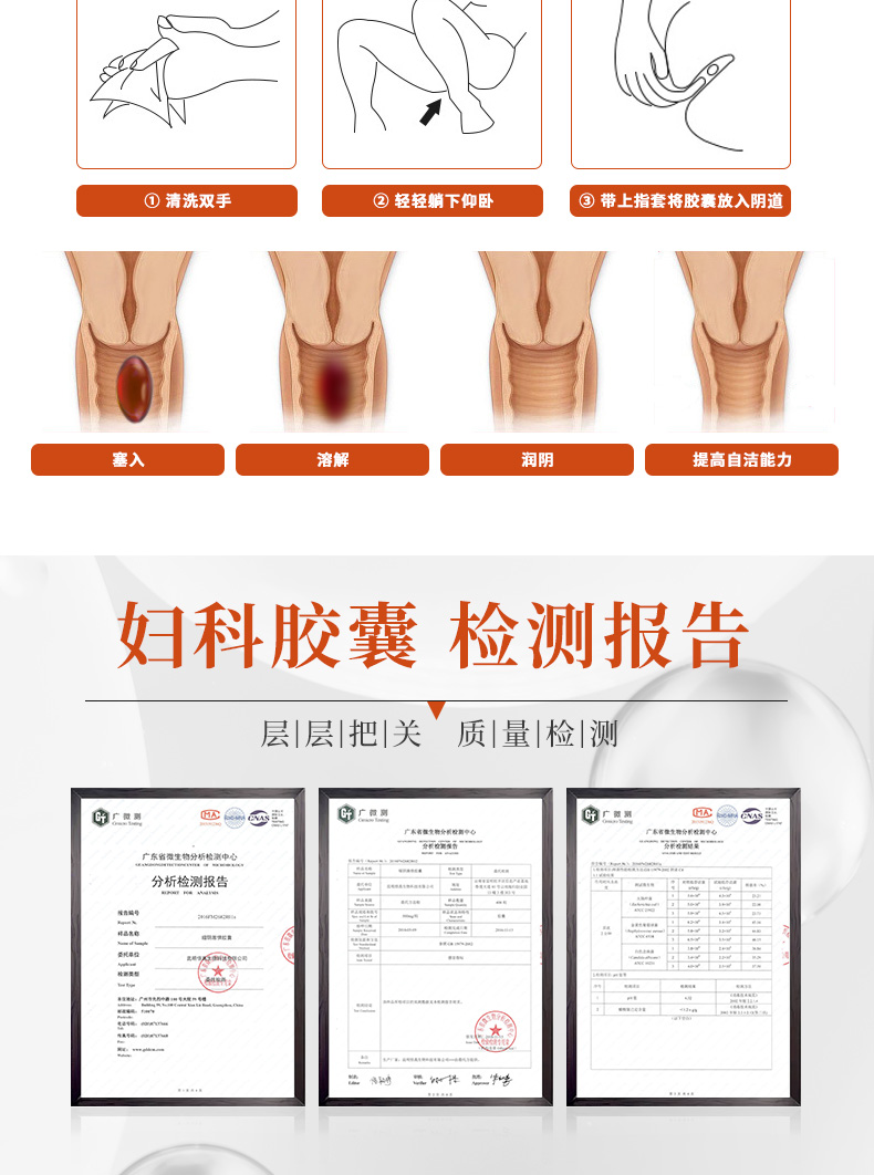 晚間清洗外陰后,取本品,仰臥中指戴套置膠囊于宮頸病變部位,15-30分鐘左右溶解。每次1-2支,10次為一療程。經(jīng)期、孕期禁用。