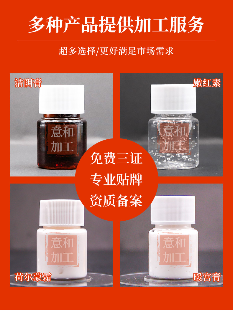 暖宮膏貼牌加工生產(chǎn)靠譜廠家廣州意和生物有限公司,是華南地區(qū)為數(shù)不多的消字號,妝字號,械字號證件齊全的公司,資質(zhì)齊全,配方成熟,服務(wù)全面,純天然中藥高端產(chǎn)品質(zhì)量。源頭生產(chǎn)廠家,4大行業(yè)生產(chǎn)字號、5大專業(yè)oem工廠、十幾年專業(yè)代工經(jīng)驗(yàn)。更有專業(yè)的研發(fā)團(tuán)隊(duì),不僅可以為客戶提供成熟配方,還可以根據(jù)客戶需求提供OEM一站加工貼牌,廣州意和以消字號個性化定制為主,專注于女性私密護(hù)理,以全面啟動女性私護(hù)管理連鎖項(xiàng)目,打造安全有效的、無憂的私人訂制特色服務(wù)標(biāo)準(zhǔn)為基準(zhǔn),為全國女性提供秘密花園養(yǎng)護(hù)基地,幫助每一位客戶實(shí)現(xiàn)私護(hù)的蛻變重生。廣州意和縮陰液OEM為廣大客戶提供產(chǎn)品的設(shè)計(jì)到生產(chǎn)一站式貼牌。