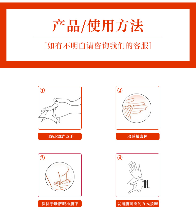 用溫水洗凈雙手,取出適量的膏體,涂抹于肚臍眼下腹下,以指腹畫圈的方式按摩。三期禁用。
