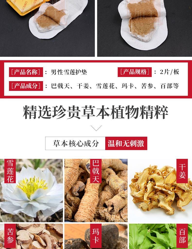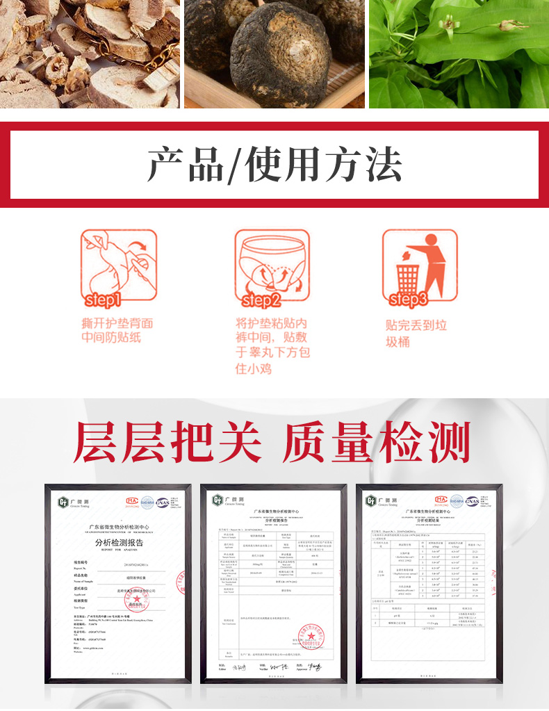 長(zhǎng)絨棉、高分子吸收樹脂、PE膜、苦參(Sophora flavescens Ait.)5%、巴戟天(MORINDA OFFICINALIS)提取物、姜(ZINGIBER OFFICINALE)根粉、東革阿里、瑪咖等。