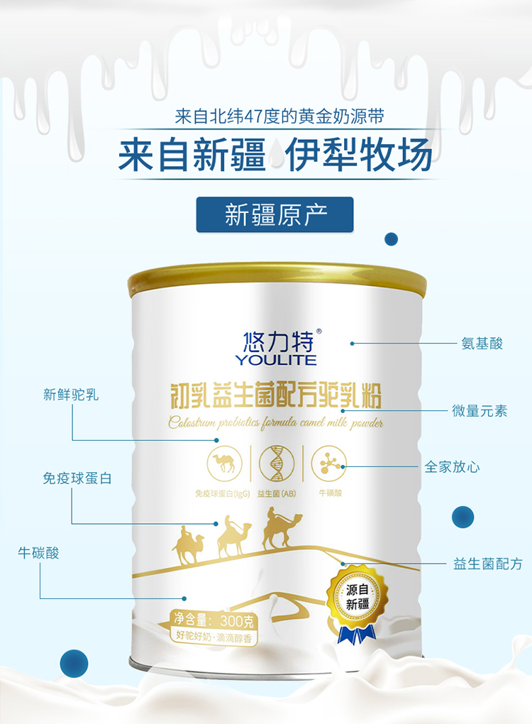 【產(chǎn)品名稱】:悠力特新疆初乳益生菌駱駝奶粉全國招商代理